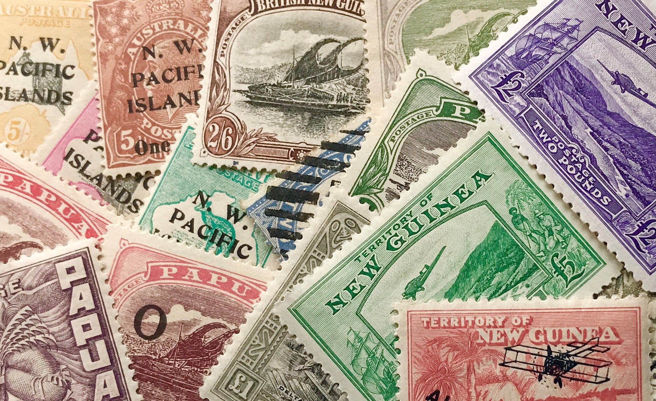 During the colonial period, both Papua and New Guinea issued their own stamps. Papua, the southeastern part of the island, issued its first stamps in 1901, featuring a portrait of Queen Victoria. New Guinea, the northern part, issued its first stamps in 1915, with designs depicting local scenes and the German imperial eagle overprinted with "G.R.I." (Georgius Rex Imperator) during World War I.